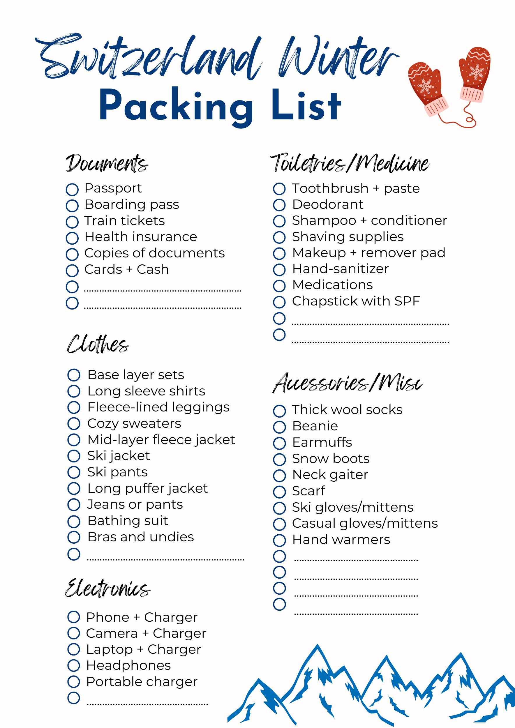Download this Switzerland packing list to make preparing for your winter trip a breeze! You can print this list out and check things off as you pack!